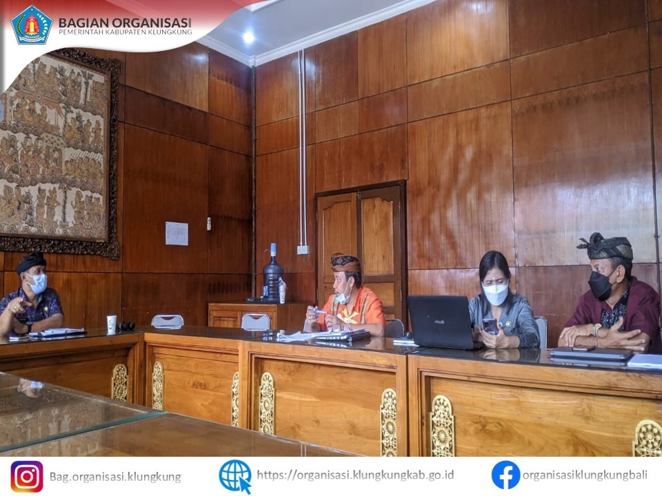 Kegiatan Desk Susunan Organisasi, Tugas dan Fungsi serta Tata Kerja Perangkat Daerah bertempat di ruang rapat Widya Praja Setda. Kabupaten Klungkung yang dipimpin oleh Asisten III Administrasi Umum Setda. Kabupaten Klungkung didampingi oleh Kepala Bagian Organisasi Setda. Kabupaten Klungkung serta Tim Evaluasi Kelembagaan. Kegiatan tersebut dilaksanakan hari kamis, 2 September 2021. Pada Desk tersebut membahas tentang Susunan Organisasi, Tugas dan Fungsi serta Tata Kerja Perangkat Daerah pada Badan Penanggulangan Bencanan Kabupaten Klungkung, Dinas Lingkungan Hidup dan Pertanahan Kabupaten Klungkun dan Rumah Sakit Umum Daerah Kabupaten Klungkung, guna meningkatkan efisiensi dan efektivitas sistem, proses, prosedur kerja yang jelas, dan terukur pada masing–masing instansi pemerintah.