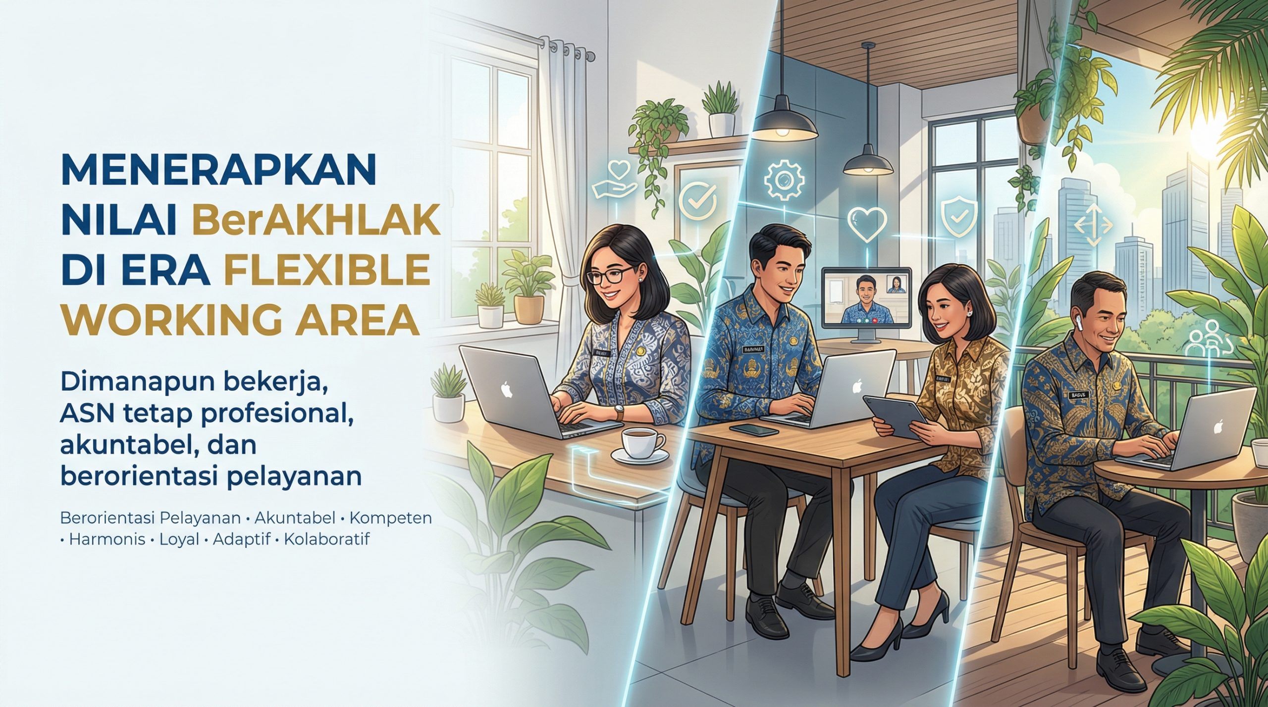 Nilai BerAKHLAK menjadi patokan kita sebagai ASN untuk senantiasa bekerja secara maksimal dengan mengedepankan pelayanan yang responsif, sifat disiplin diri yang tinggi, produktif, komunikasi yang baik, taat aturan, sigap dengan perubahan, dan terus berkolaborasi, meski pekerjaan dilaksanakan dari rumah maupun dari kantor.